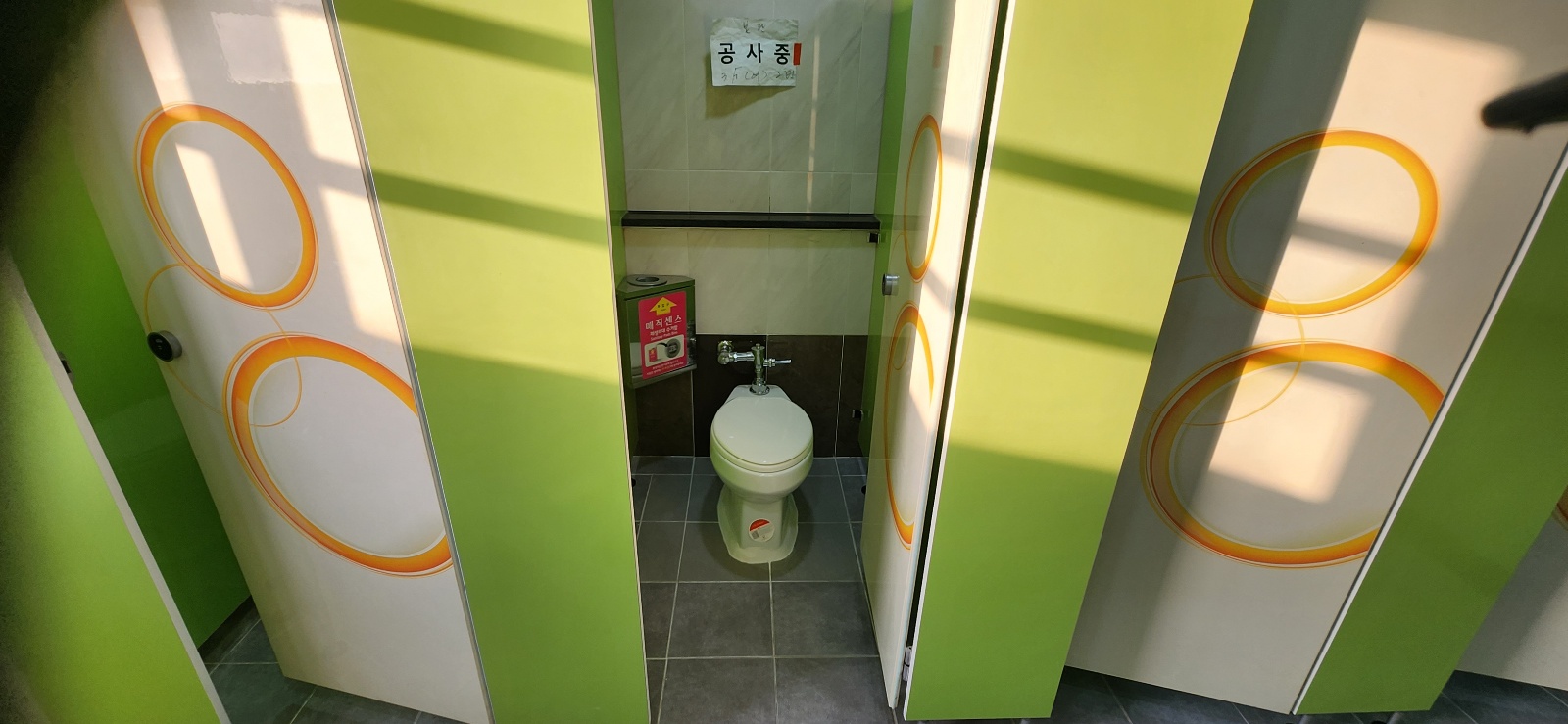 큐비클 칸막이가 협소해 양변기 설치시 문짝 부딪힐 수 있음