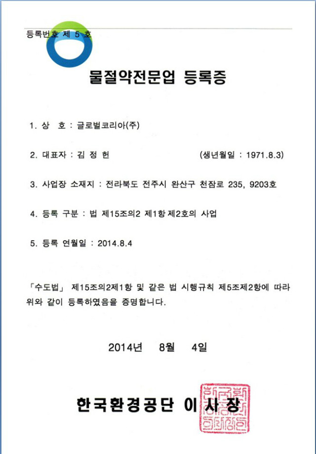 글로벌코리아 초절수양변기 GK1 각종 인증서 및 특허증